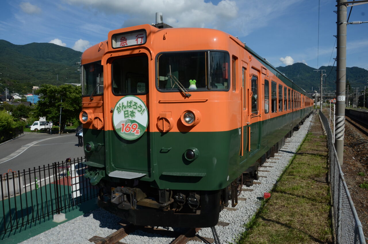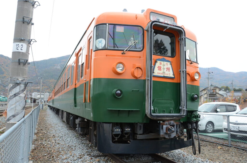 目の前に現れたのは、オレンジと緑の湘南カラーが印象的な169系電車。昭和40年代に急行信州・急行志賀として信越本線で活躍した車両で、鉄道ファンにとっては懐かしさを呼び起こす存在です。