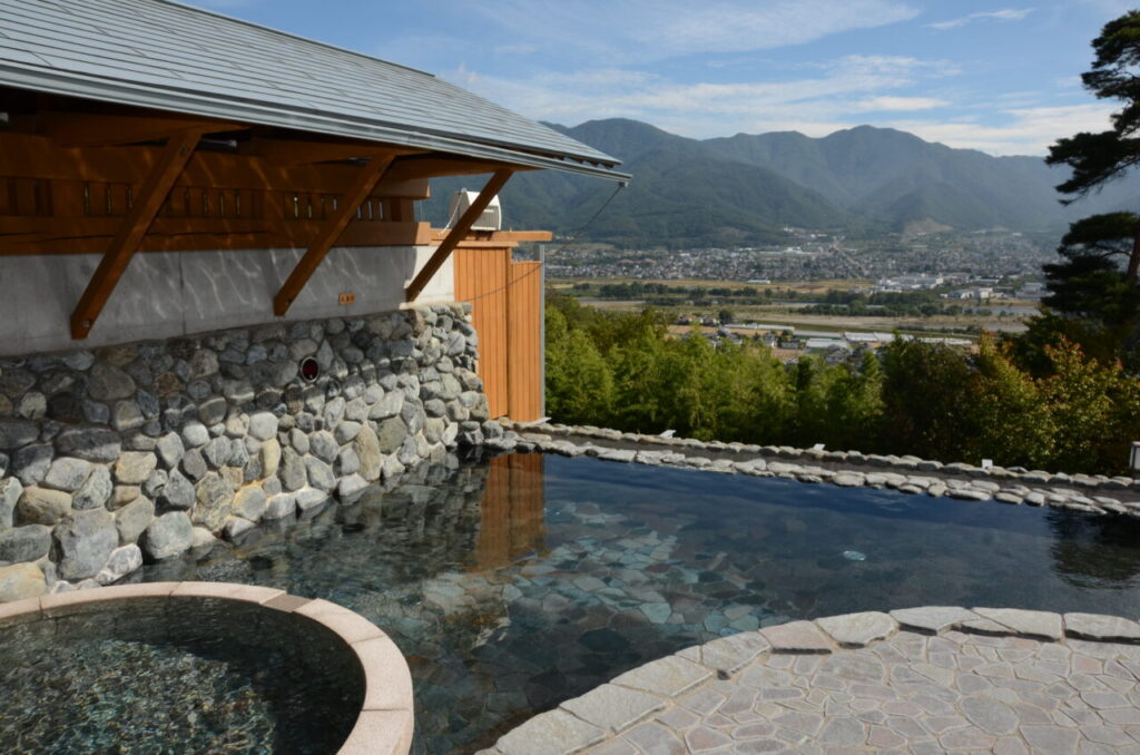 びんぐし山の高台に位置するこの温泉は、露天風呂から坂城町の街並みと千曲川が一望できます。無色透明の柔らかいお湯とほのかに感じる硫黄の香りに包まれながら旅の疲れを癒します。