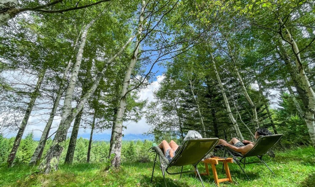 標高1,450メートルの天空白樺リゾートにあり、四季それぞれの自然を感じながら過ごせます。ご宿泊者にはチェックイン後にシャトレーゼのスイーツのサービスも。温泉やサウナもあり、ワンちゃんと一緒に宿泊ができるコテージもあります。